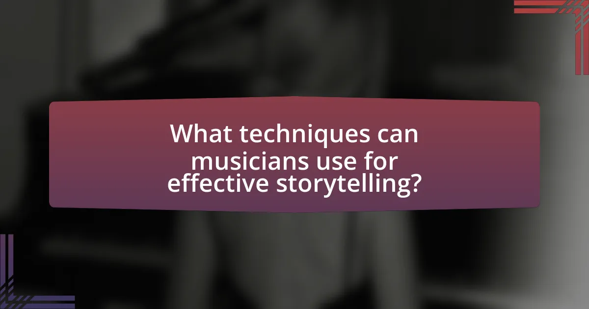 Musicians can use techniques such as lyrical imagery, narrative structure, and emotional dynamics for effective storytelling. Lyrical imagery involves using vivid and descriptive language to create mental pictures that resonate with listeners, enhancing their emotional connection to the song. Narrative structure refers to organizing the song in a way that follows a clear storyline, often with a beginning, middle, and end, which helps listeners engage with the unfolding events. Emotional dynamics, including variations in tempo, key, and instrumentation, can evoke specific feelings that align with the story being told, making the experience more immersive. These techniques are supported by research indicating that songs with strong narratives and emotional content are more likely to be remembered and resonate with audiences, as demonstrated in studies on music cognition and emotional response.